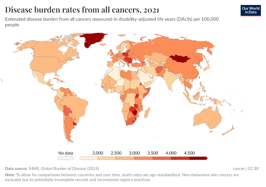 IHME, Global Burden of Disease (2024) – with minor processing by Our World in Data. “Disease burden rates from all cancers” [dataset]. IHME, Global Burden of Disease, “Global Burden of Disease - Deaths and DALYs” [original data]. Retrieved September 5, 2025 from https://data-auxiliary-trade.owid.pages.dev/grapher/disease-burden-rates-from-cancers