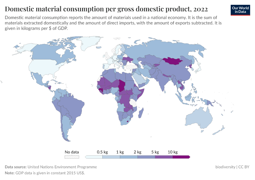 United Nations Environment Programme – processed by Our World in Data. “Domestic material consumption per gross domestic product” [dataset]. United Nations Environment Programme, “UN Statistics Division, Country Files from the UNSD/UNEP data collection on environment statistics (available at: https://unstats.un.org/unsd/envstats/country_files) - UNSD/UNEP Questionnaire, WESR / Global Material Flows Database, Eurostat” [original data]. Retrieved September 5, 2025 from https://data-auxiliary-trade.owid.pages.dev/grapher/domestic-material-consumption-per-unit-of-gdp