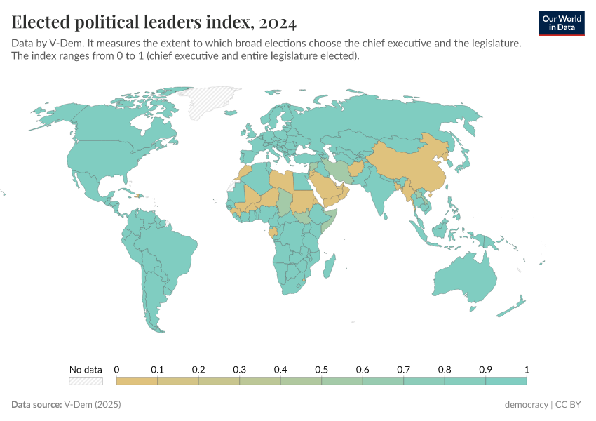 V-Dem (2025) – processed by Our World in Data. “Elected officials index” [dataset]. V-Dem, “Democracy report v15” [original data]. Retrieved September 5, 2025 from https://data-auxiliary-trade.owid.pages.dev/grapher/elected-political-leaders-index