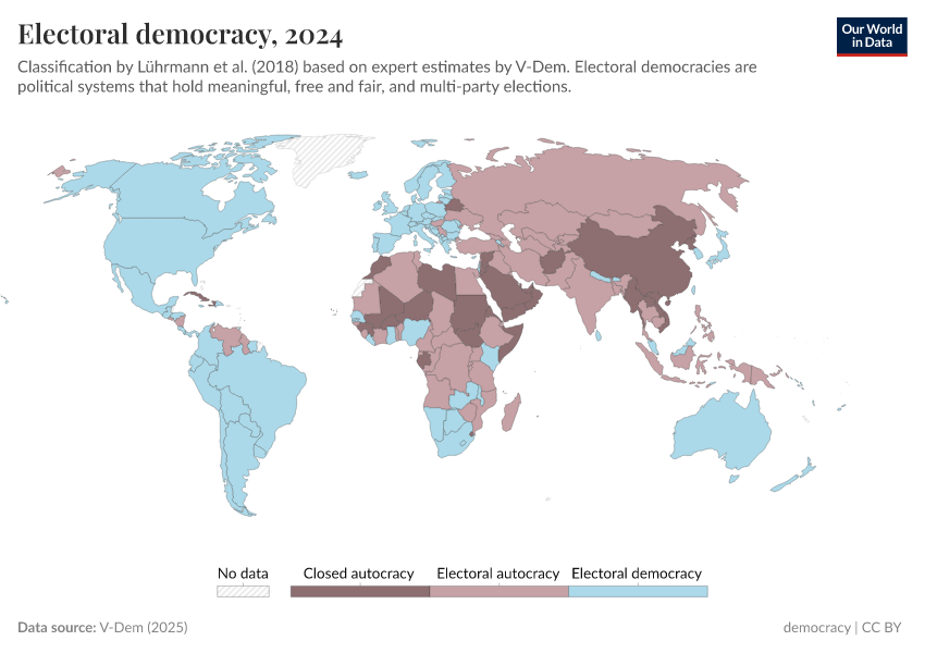 V-Dem (2025) – processed by Our World in Data. “Political regime – reduced” [dataset]. V-Dem, “Democracy report v15” [original data]. Retrieved September 5, 2025 from https://data-auxiliary-trade.owid.pages.dev/grapher/electoral-democracy-row