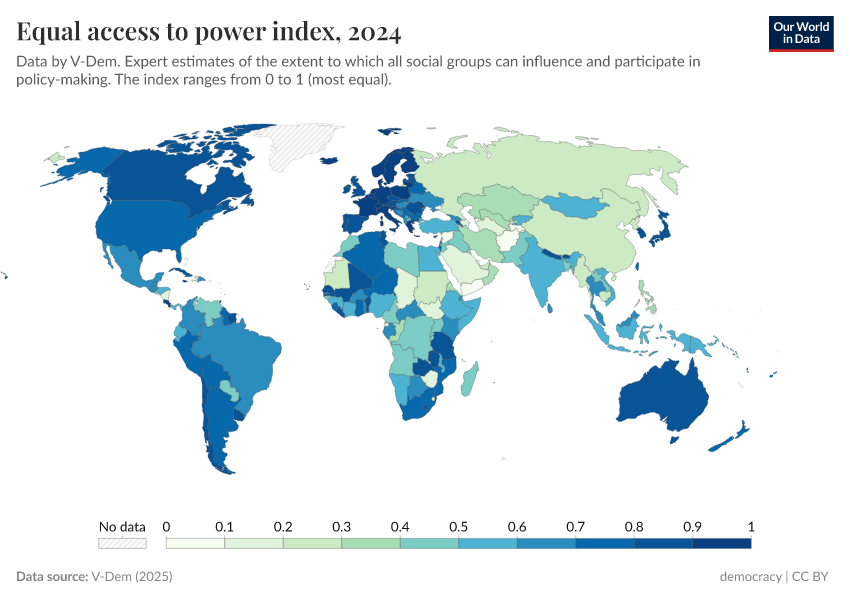 V-Dem (2025) – processed by Our World in Data. “Equal access to power index – V-Dem” [dataset]. V-Dem, “Democracy report v15” [original data]. Retrieved September 5, 2025 from https://data-auxiliary-trade.owid.pages.dev/grapher/equal-access-to-power-index
