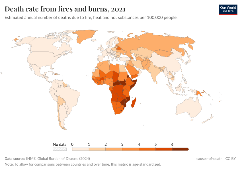 IHME, Global Burden of Disease (2024) – with minor processing by Our World in Data. “Death rate from fires and burns” [dataset]. IHME, Global Burden of Disease, “Global Burden of Disease - Deaths and DALYs” [original data]. Retrieved September 5, 2025 from https://data-auxiliary-trade.owid.pages.dev/grapher/fire-death-rates