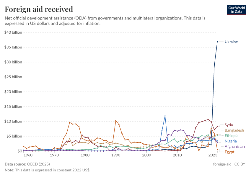 OECD (2025) – with minor processing by Our World in Data. “Foreign aid received – Official donors” [dataset]. OECD, “OECD Official Development Assistance (ODA) - DAC2A: Aid (ODA) disbursements to countries and regions” [original data]. Retrieved September 5, 2025 from https://data-auxiliary-trade.owid.pages.dev/grapher/foreign-aid-received-net