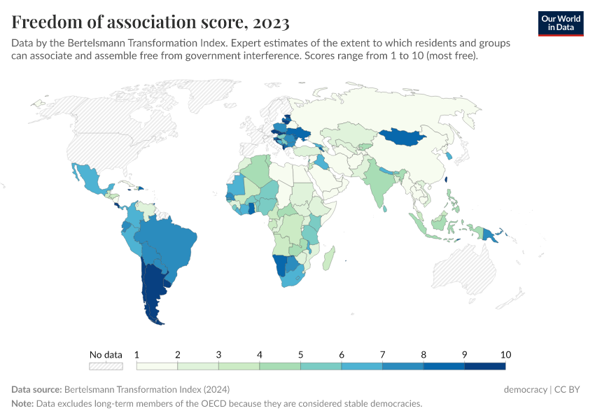 “Data Page: Freedom of association score”, part of the following publication: Bastian Herre, Lucas Rodés-Guirao, and Esteban Ortiz-Ospina (2013) - “Democracy”. Data adapted from Bertelsmann Transformation Index. Retrieved from https://data-auxiliary-trade.owid.pages.dev/grapher/freedom-of-association-score-bti [online resource]How to cite this data