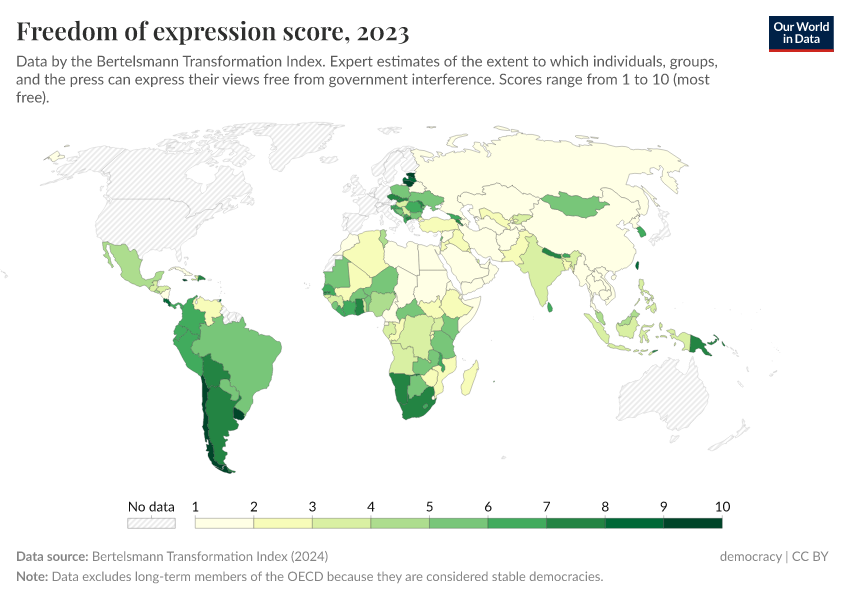 “Data Page: Freedom of expression score”, part of the following publication: Bastian Herre, Lucas Rodés-Guirao, and Esteban Ortiz-Ospina (2013) - “Democracy”. Data adapted from Bertelsmann Transformation Index. Retrieved from https://data-auxiliary-trade.owid.pages.dev/grapher/freedom-of-expression-score-bti [online resource]How to cite this data