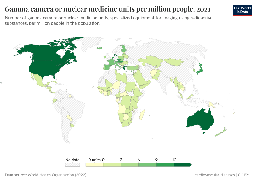 “Data Page: Gamma camera or nuclear medicine units per million people”, part of the following publication: Saloni Dattani, Veronika Samborska, Hannah Ritchie, and Max Roser (2023) - “Cardiovascular Diseases”. Data adapted from World Health Organisation. Retrieved from https://data-auxiliary-trade.owid.pages.dev/grapher/gamma-camera-or-nuclear-medicine-availability [online resource]How to cite this data