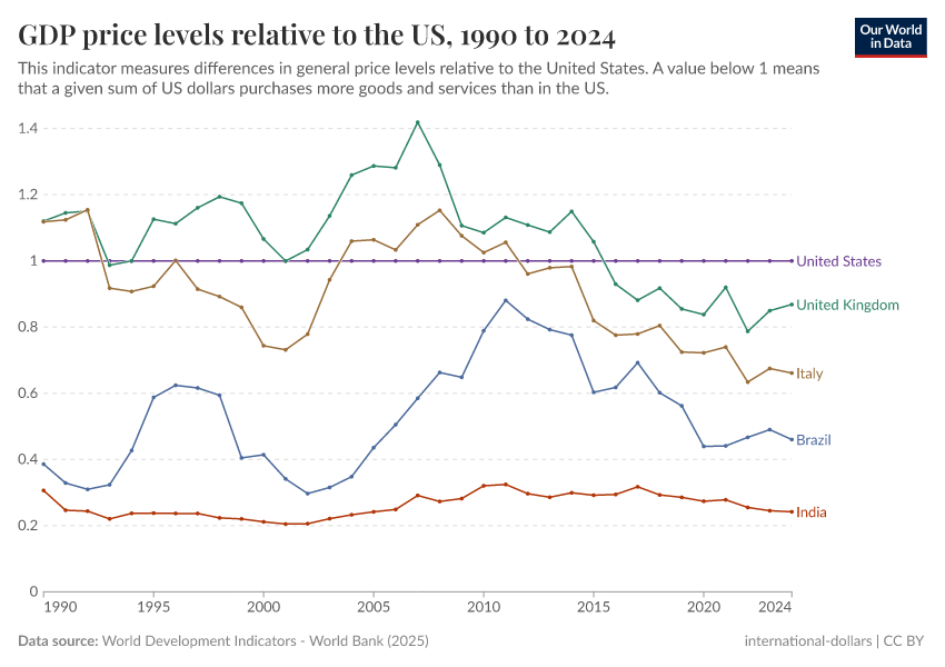Eurostat, OECD, and World Bank (2025) – processed by Our World in Data. “GDP price levels relative to the US – World Bank” [dataset]. Eurostat, OECD, and World Bank, “World Development Indicators” [original data]. Retrieved September 5, 2025 from https://data-auxiliary-trade.owid.pages.dev/grapher/gdp-price-levels-relative-to-the-us