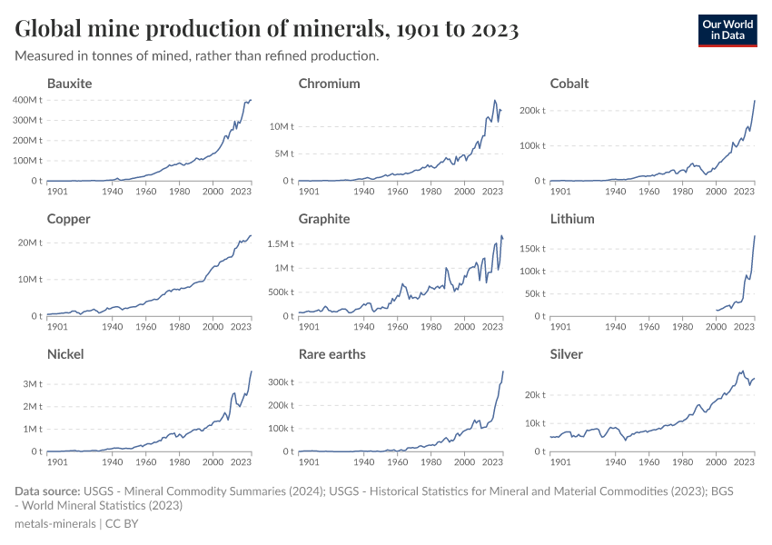 USGS - Mineral Commodity Summaries (2024); USGS - Historical Statistics for Mineral and Material Commodities (2023); BGS - World Mineral Statistics (2023) – with major processing by Our World in Data. “Global mine production of minerals” [dataset]. United States Geological Survey, “Mineral Commodity Summaries”; United States Geological Survey, “Historical Statistics for Mineral and Material Commodities”; British Geological Survey, “World Mineral Statistics” [original data]. Retrieved September 5, 2025 from https://data-auxiliary-trade.owid.pages.dev/grapher/global-mine-production-minerals
