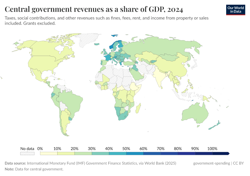 “Data Page: Central government revenues as a share of GDP”. Our World in Data (2025). Data adapted from IMF Government Finance Statistics, OECD, and World Bank. Retrieved from https://data-auxiliary-trade.owid.pages.dev/grapher/government-revenues-as-a-share-of-gdp-world-bank [online resource]How to cite this data