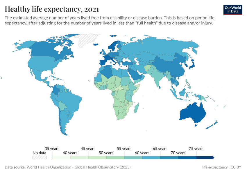 “Data Page: Healthy life expectancy”. Our World in Data (2025). Data adapted from World Health Organization. Retrieved from https://data-auxiliary-trade.owid.pages.dev/grapher/healthy-life-expectancy-at-birth [online resource]How to cite this data