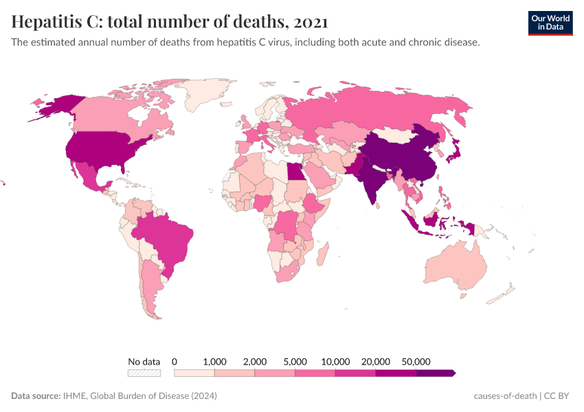 IHME, Global Burden of Disease (2024) – with minor processing by Our World in Data. “Hepatitis C: total number of deaths” [dataset]. IHME, Global Burden of Disease, “Global Burden of Disease - Deaths and DALYs” [original data]. Retrieved September 5, 2025 from https://data-auxiliary-trade.owid.pages.dev/grapher/hepatitis-c-number-of-deaths