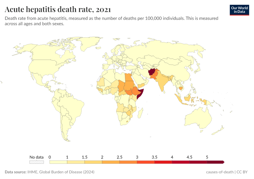 IHME, Global Burden of Disease (2024) – with minor processing by Our World in Data. “Acute hepatitis death rate” [dataset]. IHME, Global Burden of Disease, “Global Burden of Disease - Deaths and DALYs” [original data]. Retrieved September 5, 2025 from https://data-auxiliary-trade.owid.pages.dev/grapher/hepatitis-death-rate