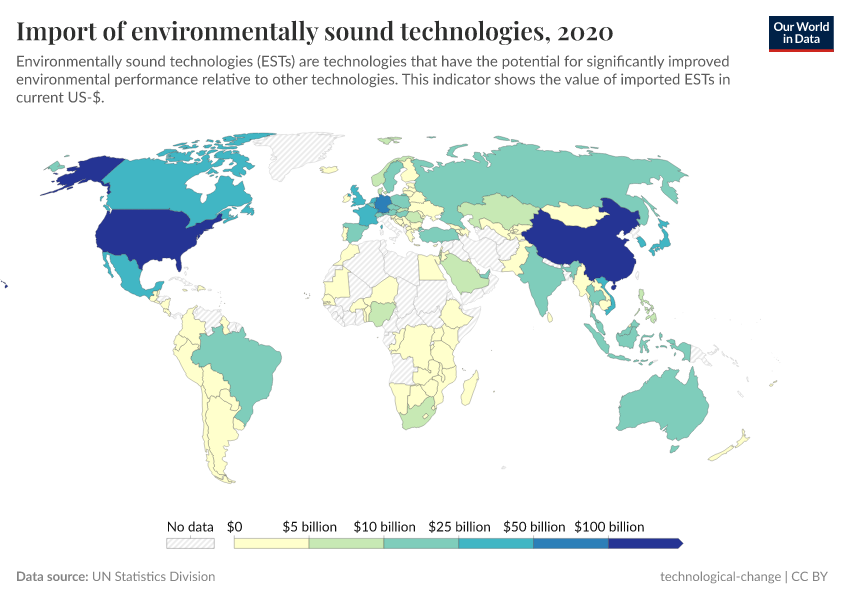 UN Statistics Division – processed by Our World in Data. “Import of environmentally sound technologies” [dataset]. UN Statistics Division, “WESR / UN COMTRADE” [original data]. Retrieved September 5, 2025 from https://data-auxiliary-trade.owid.pages.dev/grapher/import-of-environmentally-sound-technologies