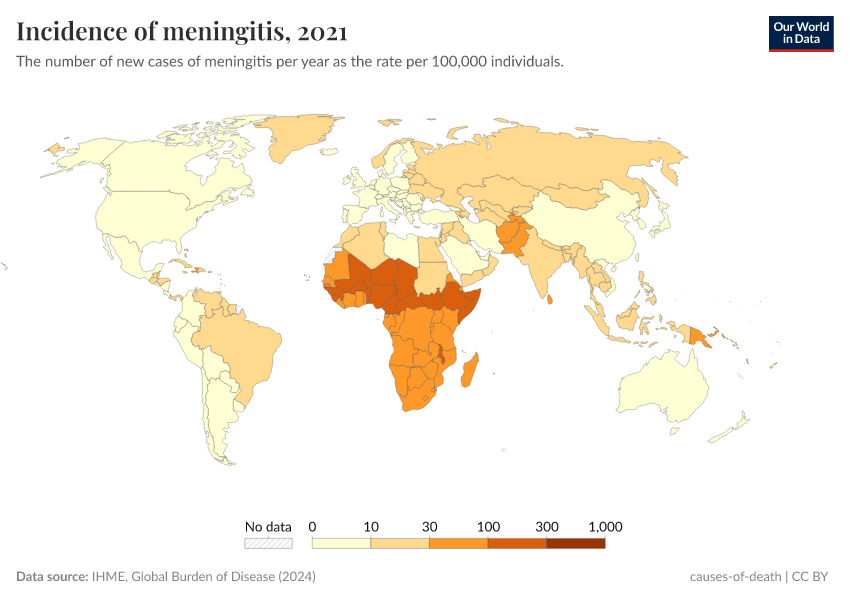“Data Page: Incidence of meningitis”, part of the following publication: Esteban Ortiz-Ospina and Max Roser (2016) - “Global Health”. Data adapted from IHME, Global Burden of Disease. Retrieved from https://data-auxiliary-trade.owid.pages.dev/grapher/incidence-of-meningitis [online resource]How to cite this data