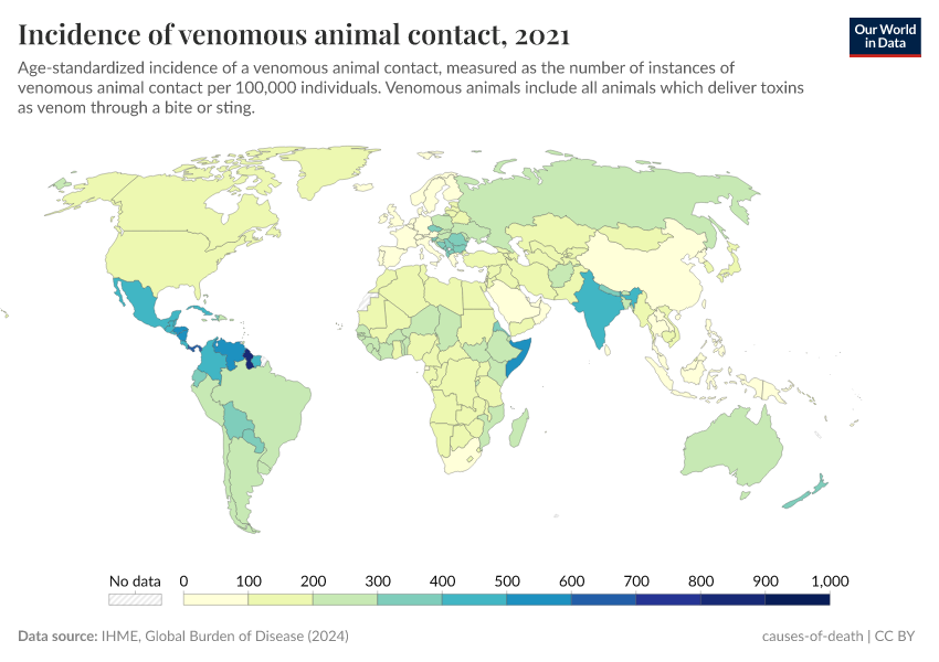 IHME, Global Burden of Disease (2024) – with major processing by Our World in Data. “Incidence of venomous animal contact” [dataset]. IHME, Global Burden of Disease, “Global Burden of Disease - Prevalence and Incidence” [original data]. Retrieved September 5, 2025 from https://data-auxiliary-trade.owid.pages.dev/grapher/incidence-of-venomous-animal-contact