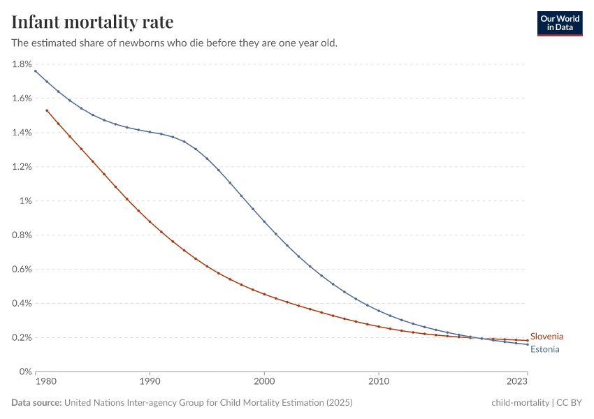United Nations Inter-agency Group for Child Mortality Estimation (2025) – with major processing by Our World in Data. “Infant mortality rate” [dataset]. United Nations Inter-agency Group for Child Mortality Estimation, “United Nations Inter-agency Group for Child Mortality Estimation”; Various sources, “Population” [original data]. Retrieved September 5, 2025 from https://data-auxiliary-trade.owid.pages.dev/grapher/infant-mortality