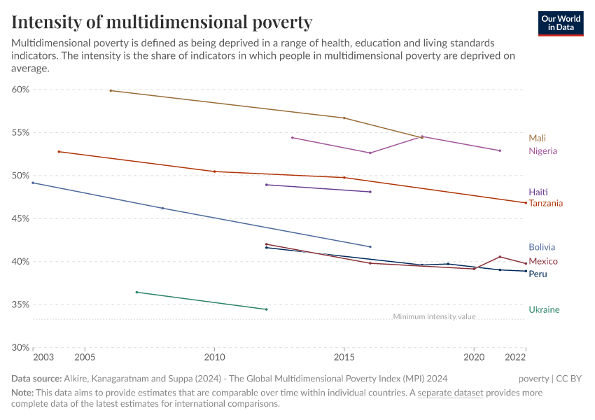 Alkire, Kanagaratnam and Suppa (2024) - The Global Multidimensional Poverty Index (MPI) 2024 – with minor processing by Our World in Data. “Intensity of multidimensional poverty – Harmonized over time” [dataset]. Alkire, Kanagaratnam and Suppa, “Global Multidimensional Poverty Index (MPI) 2024” [original data]. Retrieved September 5, 2025 from https://data-auxiliary-trade.owid.pages.dev/grapher/intensity-of-multidimensional-poverty-hot