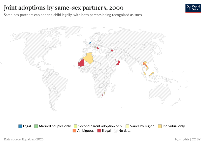 “Data Page: Joint adoptions by same-sex partners”, part of the following publication: Bastian Herre and Pablo Arriagada (2023) - “LGBT+ Rights”. Data adapted from Equaldex. Retrieved from https://data-auxiliary-trade.owid.pages.dev/grapher/joint-adoptions-same-sex-partners-equaldex [online resource]How to cite this data