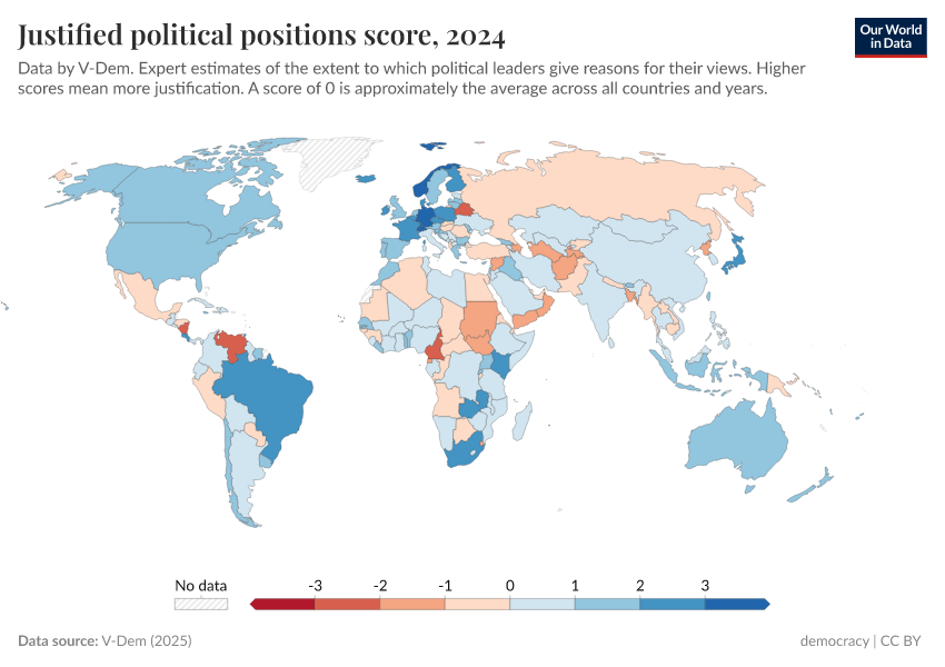 V-Dem (2025) – processed by Our World in Data. “Justified political positions – V-Dem” [dataset]. V-Dem, “Democracy report v15” [original data]. Retrieved September 5, 2025 from https://data-auxiliary-trade.owid.pages.dev/grapher/justified-political-positions-score