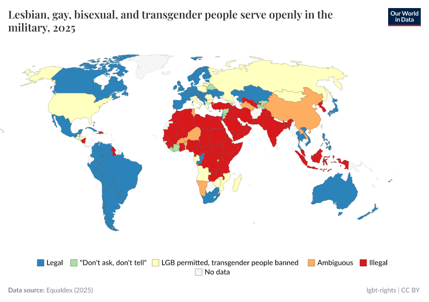 “Data Page: Lesbian, gay, bisexual, and transgender people serve openly in the military”, part of the following publication: Bastian Herre and Pablo Arriagada (2023) - “LGBT+ Rights”. Data adapted from Equaldex. Retrieved from https://data-auxiliary-trade.owid.pages.dev/grapher/lgbt-military-equaldex [online resource]How to cite this data