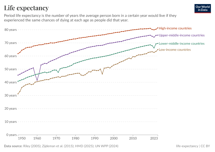 Riley (2005); Zijdeman et al. (2015); HMD (2024); UN WPP (2024) – with major processing by Our World in Data. “Life expectancy – Riley; Zijdeman et al.; HMD; UN WPP – Long-run data” [dataset]. Human Mortality Database, “Human Mortality Database”; United Nations, “World Population Prospects”; Zijdeman et al., “Life Expectancy at birth v2”; James C. Riley, “Estimates of Regional and Global Life Expectancy, 1800-2001” [original data]. Retrieved September 5, 2025 from https://data-auxiliary-trade.owid.pages.dev/grapher/life-expectancy