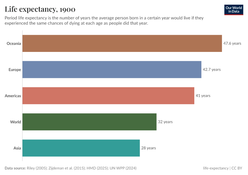 - Across the world, people are living longer. In 1900, the global average life expectancy was 32 years. By 2023, this had more than doubled to 73 years.