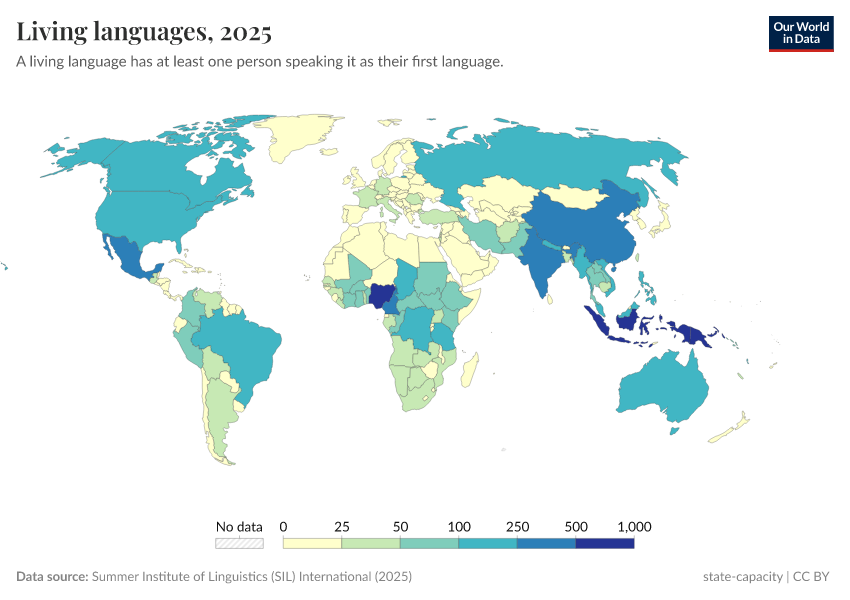 “Data Page: Living languages”, part of the following publication: Bastian Herre and Pablo Arriagada (2023) - “State Capacity”. Data adapted from Summer Institute of Linguistics (SIL) International. Retrieved from https://data-auxiliary-trade.owid.pages.dev/grapher/living-languages [online resource]How to cite this data