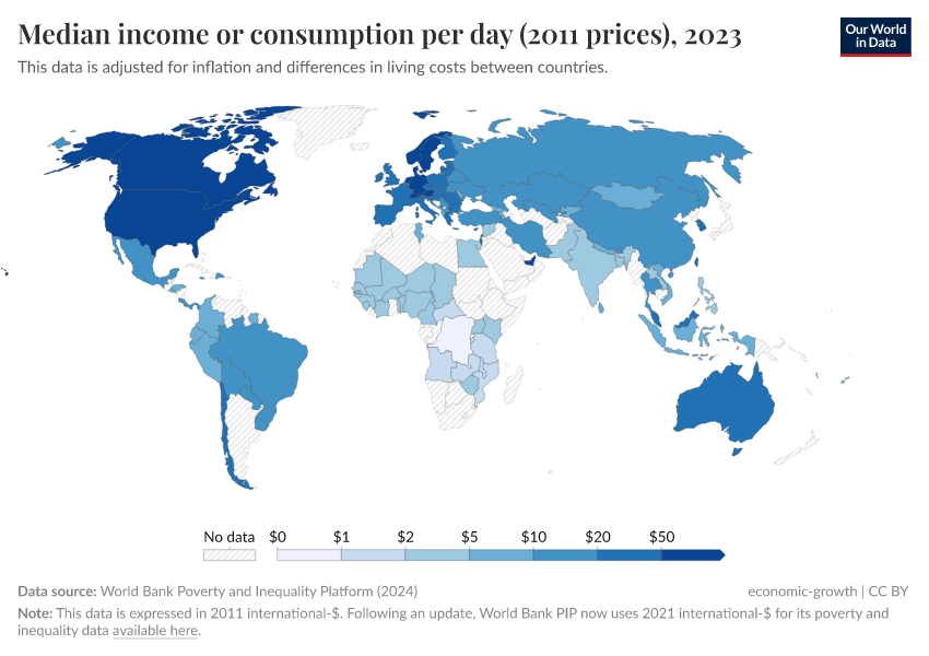 World Bank Poverty and Inequality Platform (2024) – with major processing by Our World in Data. “Median income or consumption per day (2011 prices) – World Bank” [dataset]. World Bank Poverty and Inequality Platform, “World Bank Poverty and Inequality Platform (PIP) 20240627_2017, 20240627_2011” [original data]. Retrieved September 5, 2025 from https://data-auxiliary-trade.owid.pages.dev/grapher/median-income-or-consumption-per-day-2011-prices
