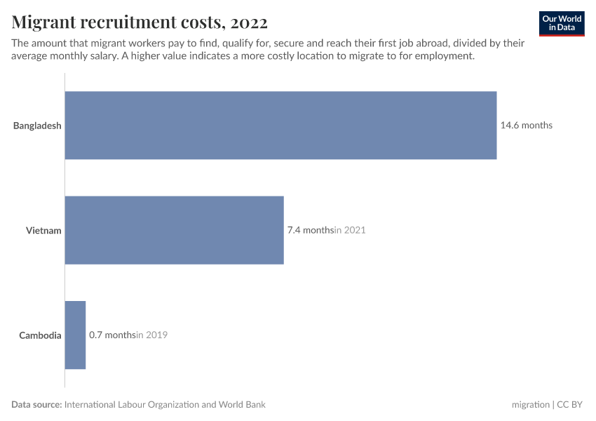 “Data Page: Migrant recruitment costs”. Our World in Data (2025). Data adapted from International Labour Organization and World Bank. Retrieved from https://data-auxiliary-trade.owid.pages.dev/grapher/migrant-recruitment-costs [online resource]How to cite this data