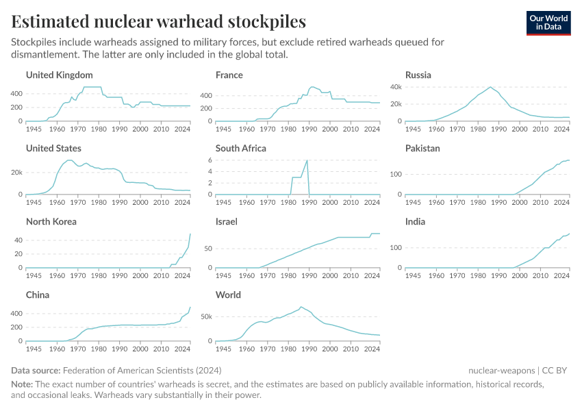 Federation of American Scientists (2024) – with minor processing by Our World in Data. “Estimated nuclear warhead stockpiles” [dataset]. Federation of American Scientists, “Estimated Global Nuclear Warhead Inventories” [original data]. Retrieved September 5, 2025 from https://data-auxiliary-trade.owid.pages.dev/grapher/nuclear-warhead-stockpiles-lines