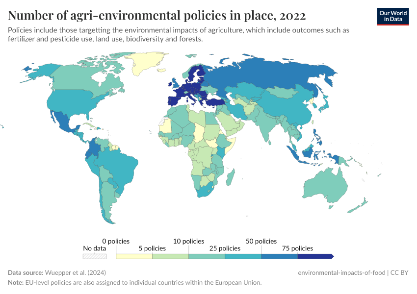 “Data Page: Number of agri-environmental policies in place”. Our World in Data (2025). Data adapted from Wuepper et al. (2024). Retrieved from https://data-auxiliary-trade.owid.pages.dev/grapher/number-agri-environmental-policies [online resource]How to cite this data