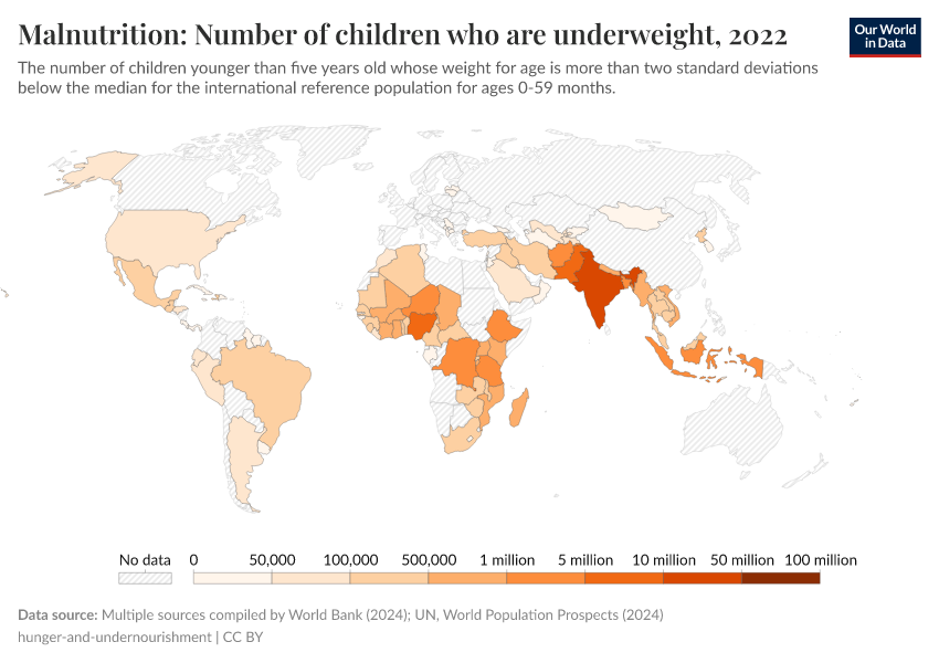 Multiple sources compiled by World Bank (2024); UN, World Population Prospects (2024) – processed by Our World in Data. “Number of underweight children – UN WPP” [dataset]. UNICEF, WHO, World Bank, “World Development Indicators”; United Nations, “World Population Prospects” [original data]. Retrieved September 5, 2025 from https://data-auxiliary-trade.owid.pages.dev/grapher/number-of-children-who-are-underweight