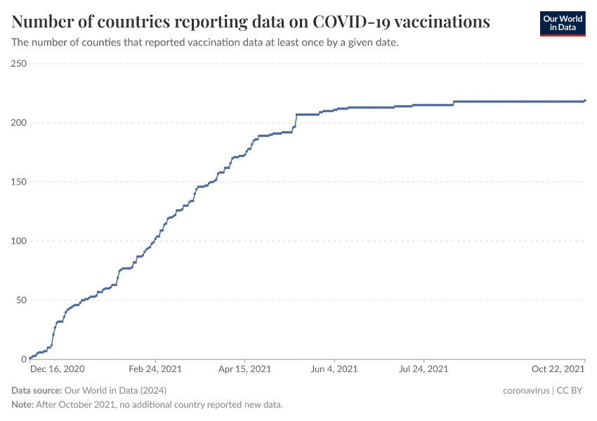 Our World in Data (2024) – processed by Our World in Data. “Number of countries reporting data on COVID-19 vaccinations” [dataset]. Our World in Data, “GitHub stats on owid/covid-19-data repository” [original data]. Retrieved September 5, 2025 from https://data-auxiliary-trade.owid.pages.dev/grapher/number-of-countries-reporting-data-on-vaccinations