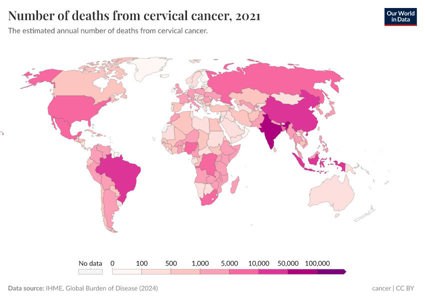 IHME, Global Burden of Disease (2024) – with minor processing by Our World in Data. “Number of deaths from cervical cancer” [dataset]. IHME, Global Burden of Disease, “Global Burden of Disease - Deaths and DALYs” [original data]. Retrieved September 5, 2025 from https://data-auxiliary-trade.owid.pages.dev/grapher/number-of-deaths-from-cervical-cancer