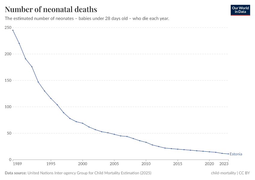 United Nations Inter-agency Group for Child Mortality Estimation (2025) – with major processing by Our World in Data. “Neonatal deaths” [dataset]. United Nations Inter-agency Group for Child Mortality Estimation, “United Nations Inter-agency Group for Child Mortality Estimation”; Various sources, “Population” [original data]. Retrieved September 5, 2025 from https://data-auxiliary-trade.owid.pages.dev/grapher/number-of-neonatal-deaths-igme