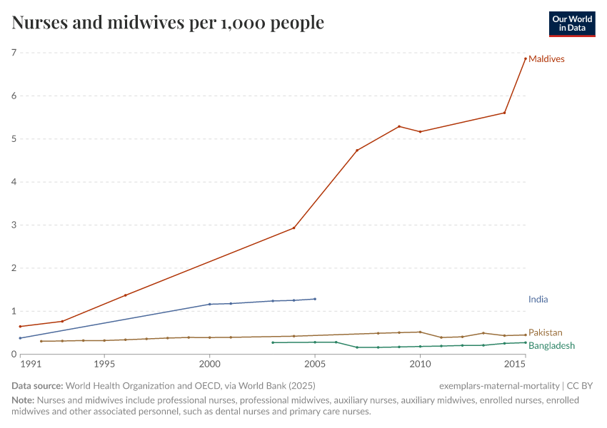 World Health Organization and OECD, via World Bank (2025) – processed by Our World in Data. “Nurses and midwives per 1,000 people” [dataset]. World Health Organization and OECD, via World Bank, “World Development Indicators” [original data]. Retrieved September 5, 2025 from https://data-auxiliary-trade.owid.pages.dev/grapher/nurses-and-midwives-per-1000-people