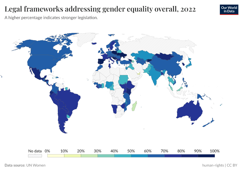 “Data Page: Legal frameworks addressing gender equality overall”. Our World in Data (2025). Data adapted from UN Women. Retrieved from https://data-auxiliary-trade.owid.pages.dev/grapher/overarching-legal-frameworks-regarding-gender-equality [online resource]How to cite this data