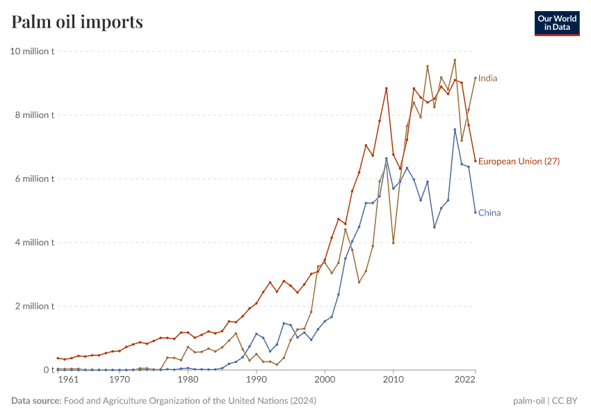 “Data Page: Imports of palm oil”. Our World in Data (2025). Data adapted from Food and Agriculture Organization of the United Nations. Retrieved from https://data-auxiliary-trade.owid.pages.dev/grapher/palm-oil-imports [online resource]How to cite this data