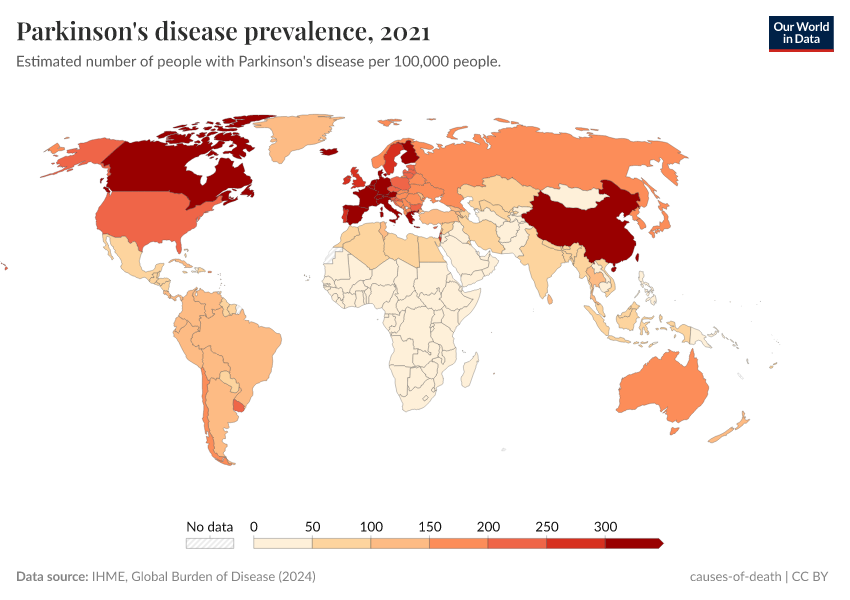 “Data Page: Parkinson's disease prevalence”, part of the following publication: Esteban Ortiz-Ospina and Max Roser (2016) - “Global Health”. Data adapted from IHME, Global Burden of Disease. Retrieved from https://data-auxiliary-trade.owid.pages.dev/grapher/parkinsons-disease-prevalence-ihme [online resource]How to cite this data