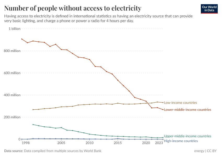 Data compiled from multiple sources by World Bank – with major processing by Our World in Data. “Number of people without access to electricity – World Bank” [dataset]. IEA, IRENA, UNSD, WHO, and World Bank, “World Development Indicators”; United Nations Population Division, Eurostat, national statistical offices, and United Nations Statistics Division, via World Bank, “World Development Indicators” [original data]. Retrieved September 5, 2025 from https://data-auxiliary-trade.owid.pages.dev/grapher/people-without-electricity-country