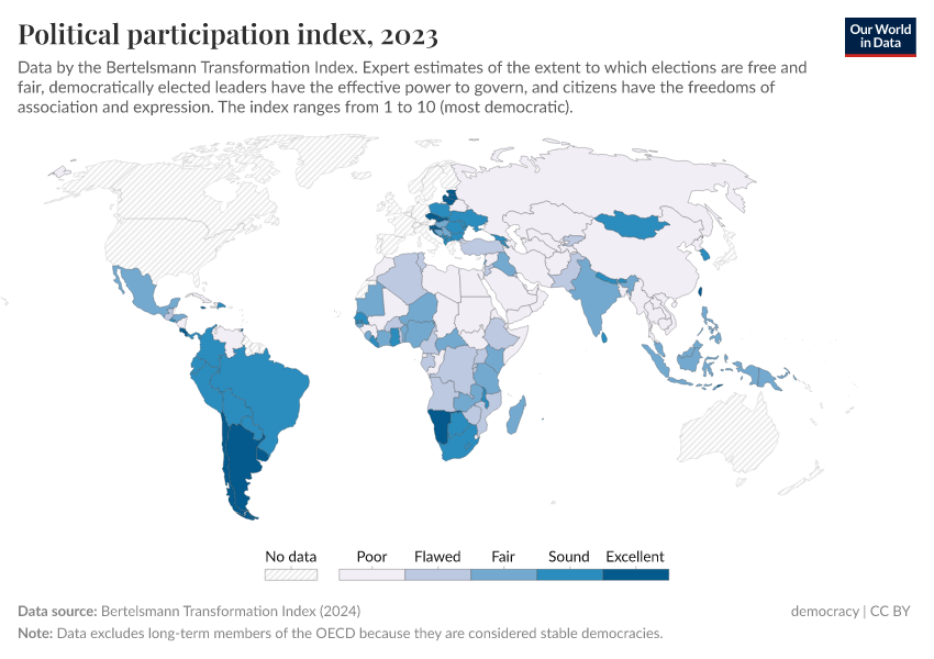 “Data Page: Political participation index”, part of the following publication: Bastian Herre, Lucas Rodés-Guirao, and Esteban Ortiz-Ospina (2013) - “Democracy”. Data adapted from Bertelsmann Transformation Index. Retrieved from https://data-auxiliary-trade.owid.pages.dev/grapher/political-participation-index-bti [online resource]How to cite this data