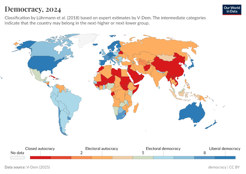 V-Dem (2025) – processed by Our World in Data. “Political regime – inc. ambiguous categories” [dataset]. V-Dem, “Democracy report v15” [original data]. Retrieved September 5, 2025 from https://data-auxiliary-trade.owid.pages.dev/grapher/political-regime-amb-row