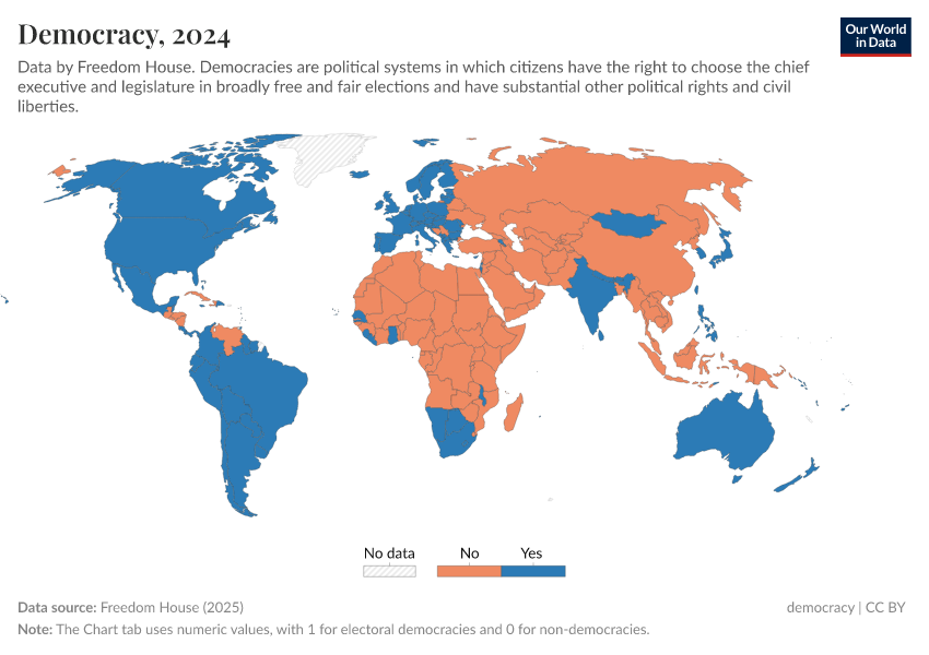 Freedom House (2025) – processed by Our World in Data. “Democracy” [dataset]. Freedom House, “Freedom in the World” [original data]. Retrieved September 5, 2025 from https://data-auxiliary-trade.owid.pages.dev/grapher/political-regime-dem-fh