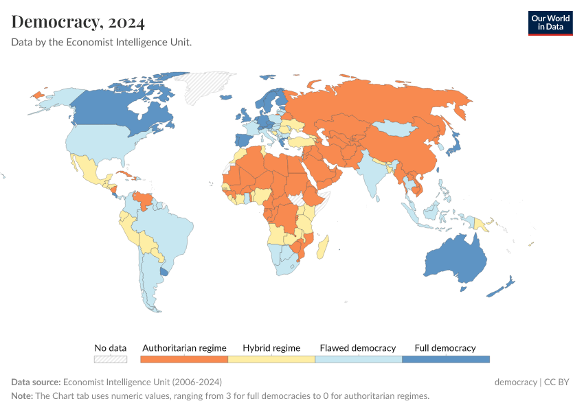 Economist Intelligence Unit (2006-2024) – processed by Our World in Data. “Democracy” [dataset]. Economist Intelligence Unit, “Democracy Index 2021: The China challenge”; Economist Intelligence Unit, “Democracy Index 2022: Frontline democracy and the battle for Ukraine”; Economist Intelligence Unit, “Democracy Index 2023: Age of Conflict”; Economist Intelligence Unit, “Democracy Index 2024: What's wrong with representative democracy?”; Gapminder, “Democracy Index v4” [original data]. Retrieved September 5, 2025 from https://data-auxiliary-trade.owid.pages.dev/grapher/political-regime-eiu