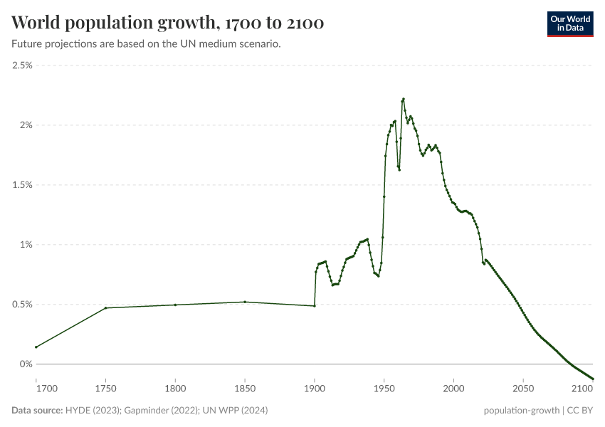 “Data Page: World population growth”, part of the following publication: Hannah Ritchie, Lucas Rodés-Guirao, Edouard Mathieu, Marcel Gerber, Esteban Ortiz-Ospina, Joe Hasell, and Max Roser (2023) - “Population Growth”. Data adapted from PBL Netherlands Environmental Assessment Agency, Gapminder, United Nations. Retrieved from https://data-auxiliary-trade.owid.pages.dev/grapher/population-growth-rate [online resource]How to cite this data
