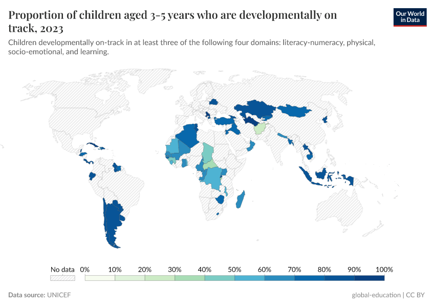 “Data Page: Proportion of children aged 3-5 years who are developmentally on track”. Our World in Data (2025). Data adapted from UNICEF. Retrieved from https://data-auxiliary-trade.owid.pages.dev/grapher/proportion-of-children-developmentally-on-track [online resource]How to cite this data