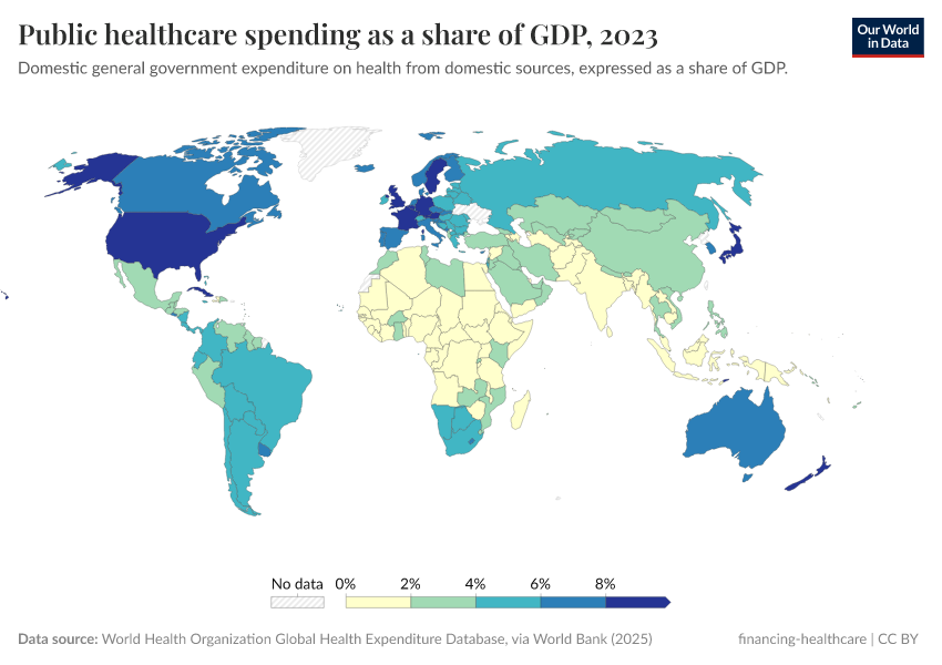 “Data Page: Public healthcare spending as a share of GDP”. Our World in Data (2025). Data adapted from World Health Organization Global Health Expenditure Database, via World Bank. Retrieved from https://data-auxiliary-trade.owid.pages.dev/grapher/public-healthcare-spending-share-gdp [online resource]How to cite this data