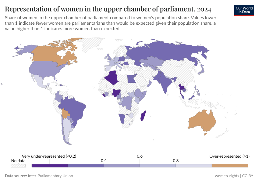 “Data Page: Representation of women in the upper chamber of parliament”. Our World in Data (2025). Data adapted from Inter-Parliamentary Union. Retrieved from https://data-auxiliary-trade.owid.pages.dev/grapher/representation-of-women-in-the-upper-chamber-of-parliament [online resource]How to cite this data