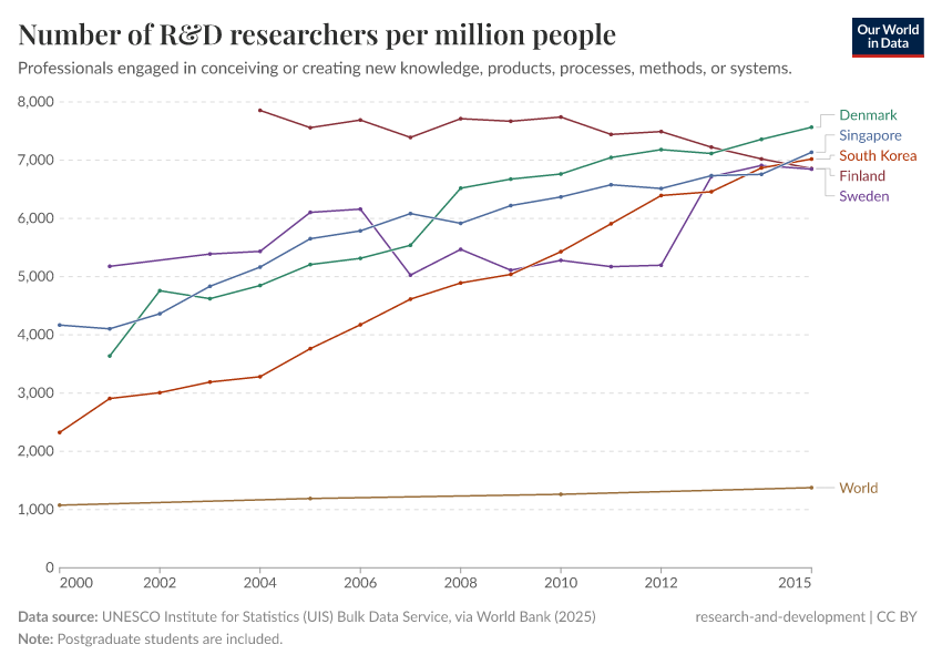 “Data Page: Number of R&D researchers per million people”. Our World in Data (2025). Data adapted from UNESCO Institute for Statistics (UIS), via World Bank. Retrieved from https://data-auxiliary-trade.owid.pages.dev/grapher/researchers-in-rd-per-million-people [online resource]How to cite this data