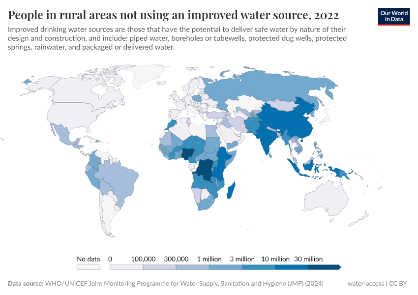 WHO/UNICEF Joint Monitoring Programme for Water Supply, Sanitation and Hygiene (JMP) (2024) – with major processing by Our World in Data. “People in rural areas not using an improved water source” [dataset]. WHO/UNICEF Joint Monitoring Programme for Water Supply, Sanitation and Hygiene (JMP), “WHO/UNICEF Joint Monitoring Programme for Water Supply, Sanitation and Hygiene (JMP) - Households”; WHO/UNICEF Joint Monitoring Programme for Water Supply, Sanitation and Hygiene (JMP), “WHO/UNICEF Joint Monitoring Programme for Water Supply, Sanitation and Hygiene (JMP) - Households - Regions” [original data]. Retrieved September 5, 2025 from https://data-auxiliary-trade.owid.pages.dev/grapher/rural-without-improved-water